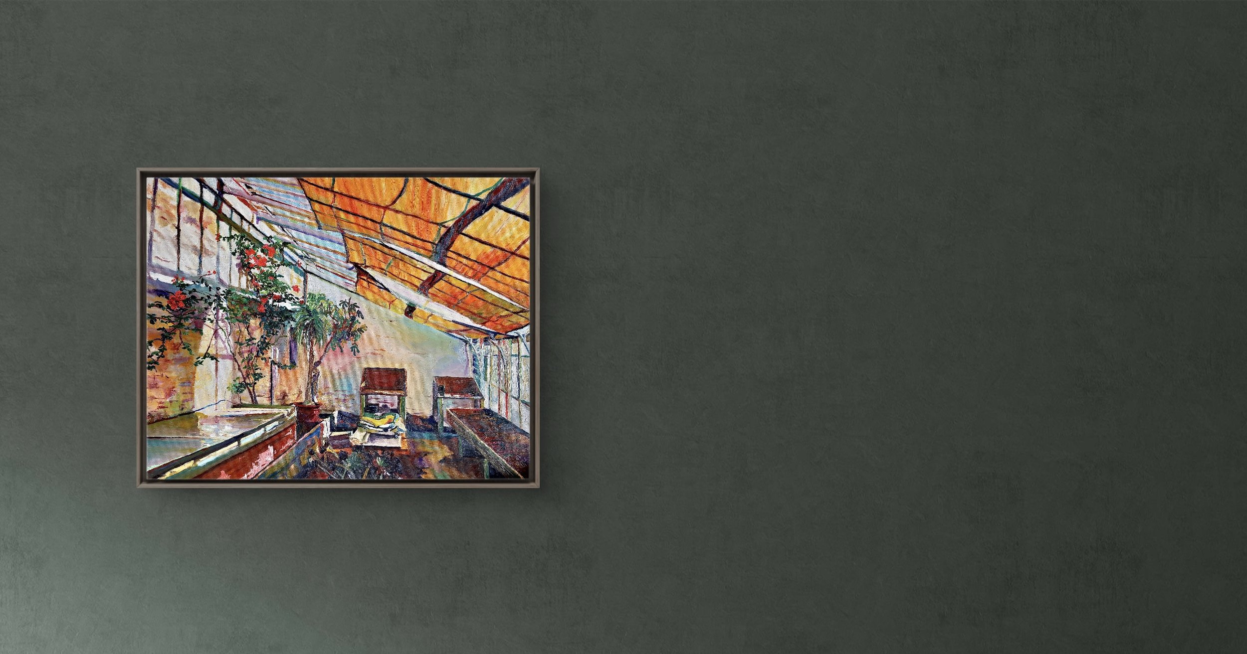 Cette toile représente le jardin d’une maison familiale qui a été cédée. A défaut de pouvoir continuer d’y aller, la commanditaire en a fait son tableau de salon (aux couleurs de son canapé).